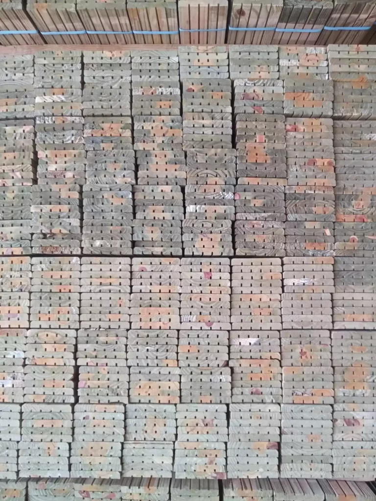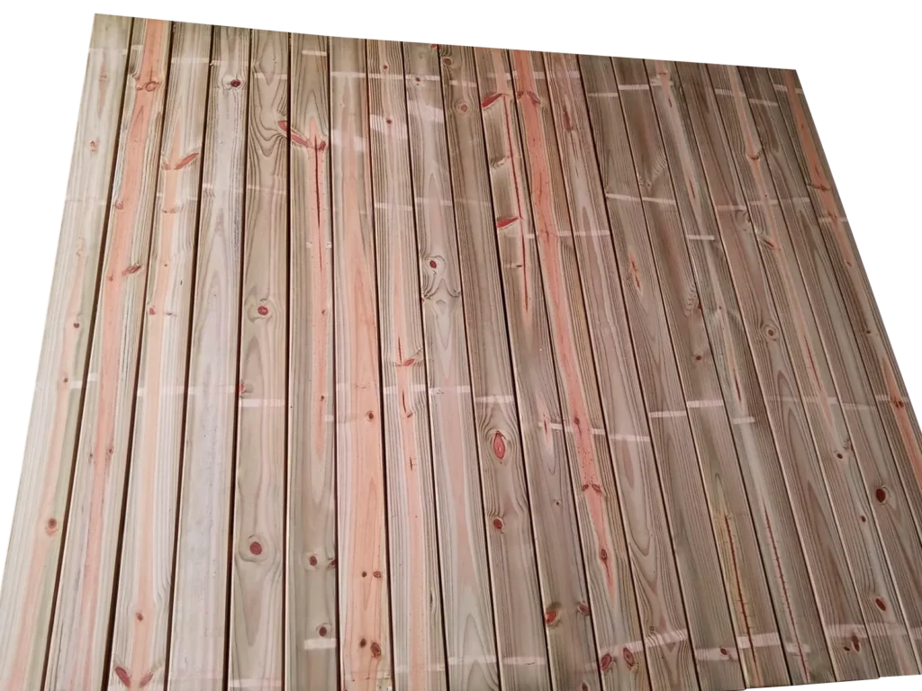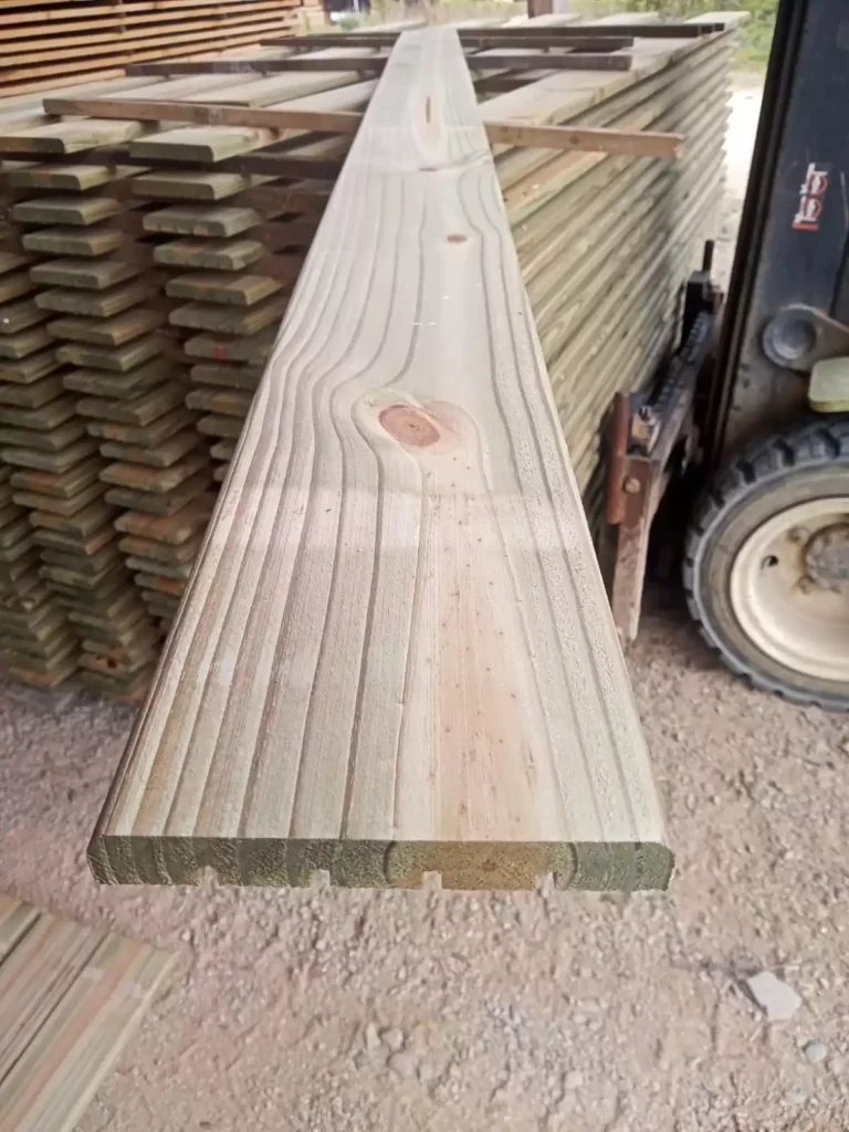 Deck de pinus tratado com nós (natural da madeira de pinus), usado para piso.